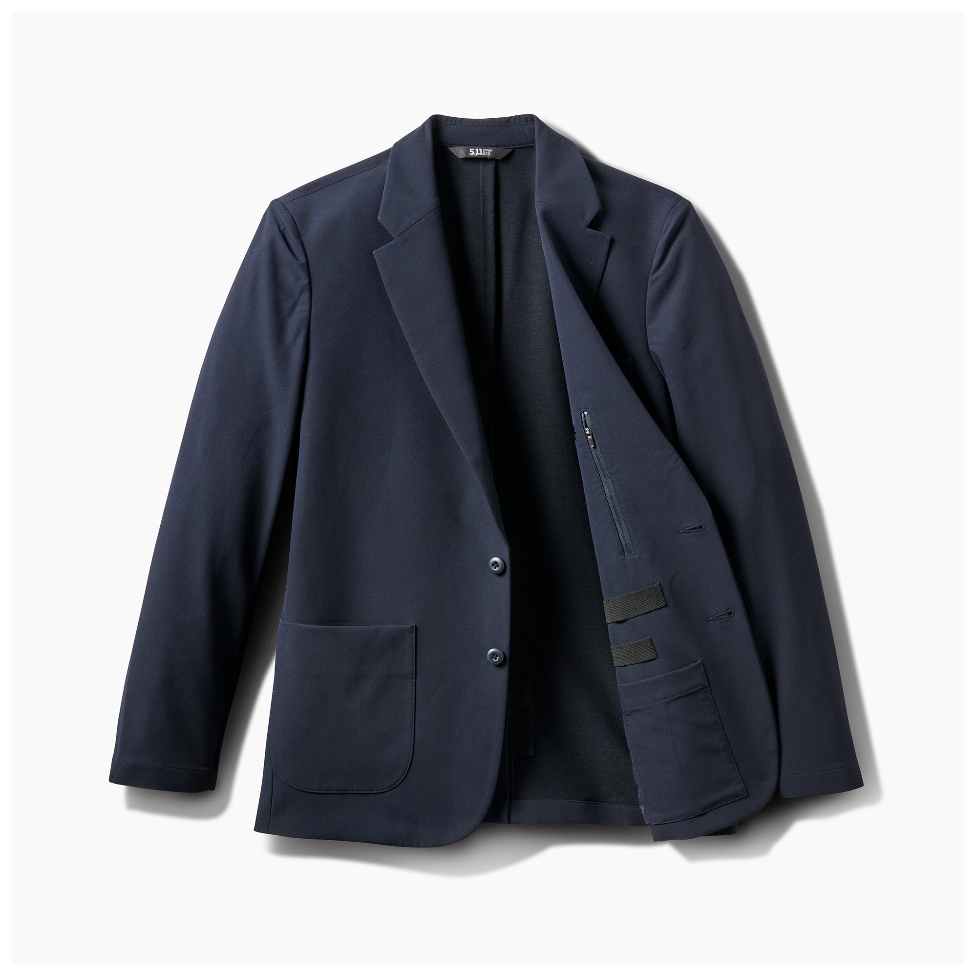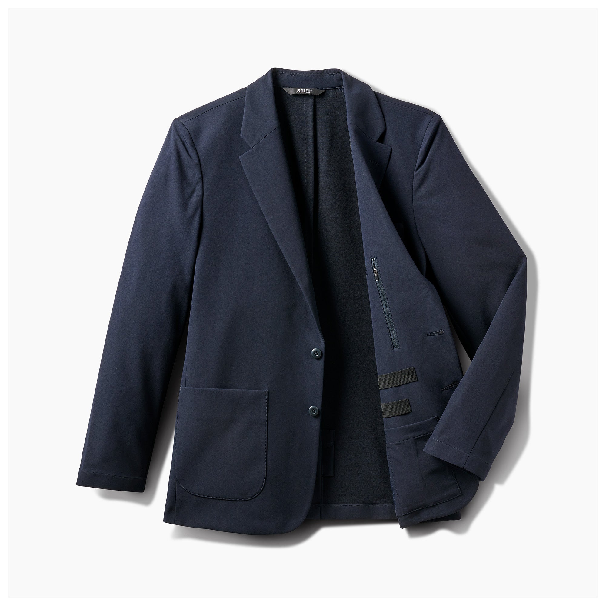 Founder’s Jacketは、ビジネスシーンに違和感なく着用できる上品なブレザーでありながら、5.11ならではのタクティカル機能を秘めています。撥水性とストレッチ性に優れたダブルウィーブ生地を使用し、軽量かつ耐久性のある裏地を採用。出張や移動先でも扱いやすく、シワになりにくい設計です。