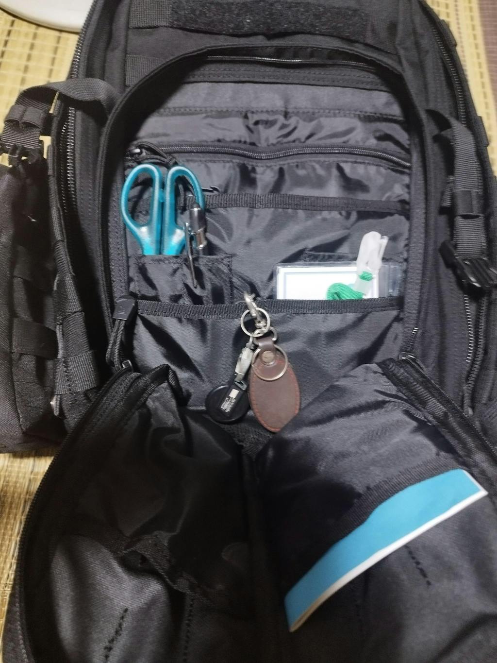 水害に遭ったので「これはいけない」ということでEDC用、何かあった時のお守りとして購入させて頂きました。触って一発でわかる素材の頑丈さ(素材が明らかに厚い)、メインポケットがバッグ底部までしっかり開いてくれるのはミリタリーバッグ初心者の自分にとっては革命でした。メインコンポーネントの蓋側にメッシュが付いているのもいいですね。あまり大きいのを入れるとメインの収納スペースが減ってしまうのですが何が入っているかが一発でわかる、あと散逸してほしくないものを入れるのに使えますね。自分は筆箱と救急箱の収納に使っています。アドミンに沢山の仕分けがあるのもいいですね。いろいろ突っ込める。肝心の背負い心地ですが、小柄な人間に丁度いいかもしれません。背面のパッドのおかげで荷物の中に硬いものがあってもそれを感じにくいし、しょい込もうとした時のバッグの変形も防げます。いいですね。